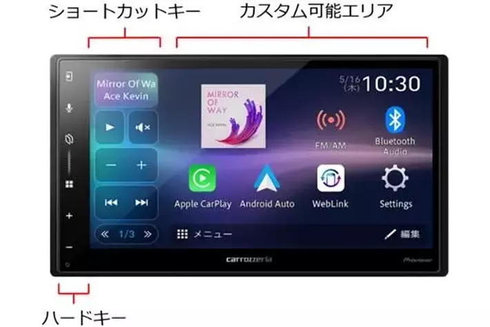 楽曲の再生/停止やミュート機能、イコライザー設定、FMラジオ設定など使用頻度の高い機能をホーム画面のショートカットキーで操作できるほか、機能アイコンの配置も好みに合わせてカスタマイズできるので、直感的でスムーズな操作が可能です。また、静電フラットタイプのハードキーに、ダイレクトに「Apple CarPlay」「Android Auto」画面に遷移する操作キーを配置しています。