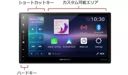 楽曲の再生/停止やミュート機能、イコライザー設定、FMラジオ設定など使用頻度の高い機能をホーム画面のショートカットキーで操作できるほか、機能アイコンの配置も好みに合わせてカスタマイズできるので、直感的でスムーズな操作が可能です。また、静電フラットタイプのハードキーに、ダイレクトに「Apple CarPlay」「Android Auto」画面に遷移する操作キーを配置しています。