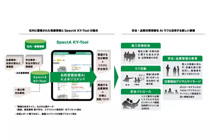 「SpectA KY-Tool」は安全管理・品質管理業務における情報活用課題への対策に特化型のAIソリューションです。建設業やプラントEPC/O&Mなどの施工現場において急速に導入が進んでいます。