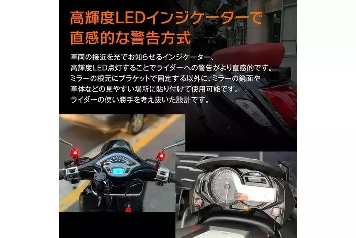 車両の接近を光でお知らせるインジケーターを高輝度LED点灯にすることで、ライダーへの警告がより直感的となります。 ミラーの根元にブラケットで固定する以外に、ミラーの鏡面や車体などの見えやすい場所に貼り付けて使用可能です。 ライダーの使い勝手を考え抜いた設計となっています。