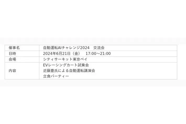 後援(予定):経済産業省、東京大学生産技術研究所、東京大学モビリティ・イノベーション連携研究機構、一般社団法人日本自動車工業会、一般社団法人日本自動車部品工業会、一般社団法人日本ディープラーニング協会、特定非営利活動法人ITSJapan