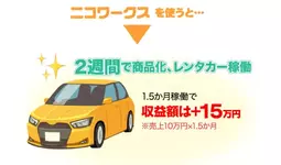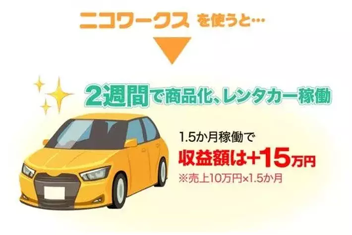 例えば車両を2ヶ月放置した場合、損失額は計20万円にも上ります。しかしながらニコワークスを利用することで2週間で商品化し、その後1ヶ月半稼働させていれば、15万円の売上を生み出すことが可能!