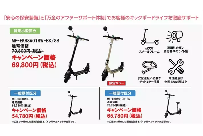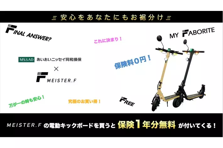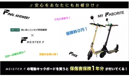 同社のモビリティを中心としたブランド「MEISTER.F(マイスターエフ)」の電動キックボードで走行中に「もしも」や「万が一」の怪我をしても、安心な傷害保険を1年間無償で受けられるサービスで、「保安部品の充実」「アフターサポート拠点の充実」「安心の1年保証」と併せて「買って安心」・「乗って安心」を強化したサービスとなります。