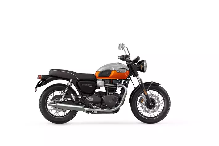 ハンドペイントのピンストライプが入った2色のタンクスキームを採用するアイコニックなボンネビルT100には、新しくスタイリッシュなアルミニウムシルバー&バハオレンジのタンクと、ジェットブラックのマッドガード、ヘッドライトボウル、サイドパネルを装備。