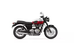 伝説のボンネビルT120には、クリスタル・ホワイト&クランベリーレッドのタンクに、ジェットブラックのマッドガード、ヘッドライトボウル、サイドパネルを装備。
