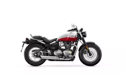クラシックなボンネビル・スピードマスターには鮮やかなスノードニアホワイト&クランベリーレッドの2色タンク、サファイアブラックのマッドガード、ヘッドライトボウル、サイドパネルを装備。