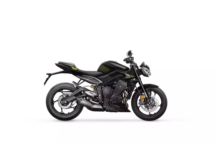 Street Triple 765 RSは、ファントムブラックのタンクカバーとパネル、ファントムブラックのフロントマッドガード、ヘッドライトフィニッシャー、ベリーパン、シートカウルにイエローのアクセントを加え、ステルス性の高いファントムブラックをラインアップに加えました。