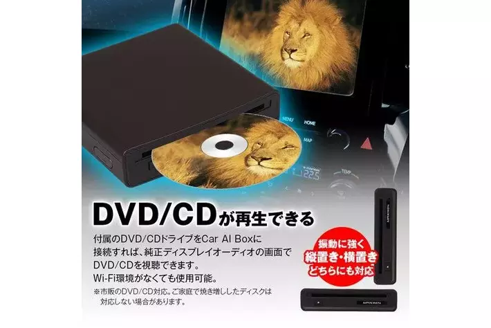 車載専用のDVD/CDドライブをCar AI Boxに接続すれば、純正ディスプレイオーディオの画面でDVD/CDを視聴できます。Wi-Fi環境がなくても使用可能。