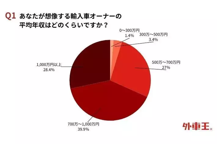 ・調査内容:Q1.あなたが想像する輸入車オーナーの平均年収はどのくらいですか?/Q2. 輸入車オーナーであるあなたの年収はどのくらいですか?/Q3. あなたの所有している輸入車の車名を教えてください。/Q4.Q3の輸入車を購入された理由や魅力だと思うポイントを教えてください。