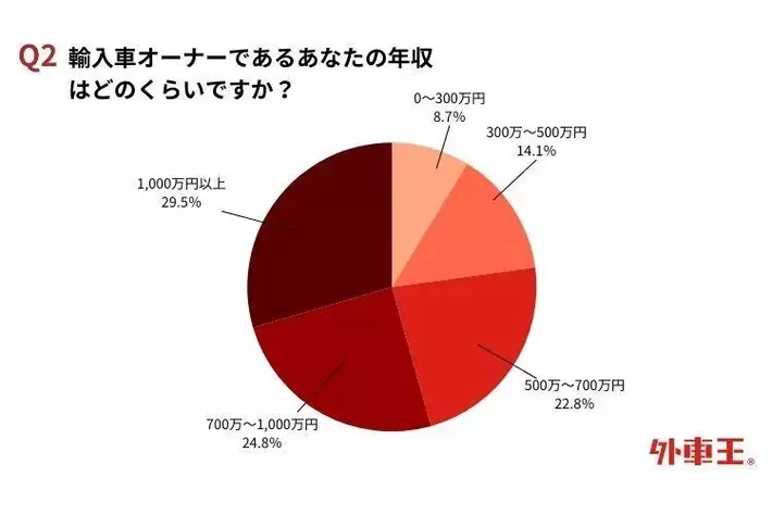 一方で、300万~500万円と0~300万円の年収帯の割合も驚きの結果です。Q1の想像される輸入車オーナーの平均年収では、300万~500万円が3.4%、0~300万円が1.4%だったのに対し、実際には300万~500万円が14.1%、0~300万円が8.7%も存在するということがわかりました。輸入車オーナー=高所得者という図式はイメージ通りではありつつも、平均給与を下回る方でも所有しているという現状が明らかになりました。収入を理由に輸入車の購入を諦めている方にとって、嬉しい事実ではないでしょうか。