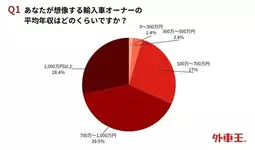 ・調査内容:Q1.あなたが想像する輸入車オーナーの平均年収はどのくらいですか?/Q2. 輸入車オーナーであるあなたの年収はどのくらいですか?/Q3. あなたの所有している輸入車の車名を教えてください。/Q4.Q3の輸入車を購入された理由や魅力だと思うポイントを教えてください。