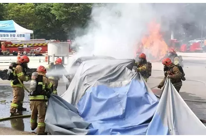 HUERTEM社の防火ブランケットは、韓国国内の特許技術『HighSlica特殊防炎コーティング』により約1800度~2000度の燃焼温度にも耐えることができます。 EV車の火災の場合、最高温度は1200~1600度まで上昇するといわれており*1、同社の防火ブランケットを使用することで、消火、有毒ガスの噴出防止、炎と煙を抑制し二次災害を防止します。