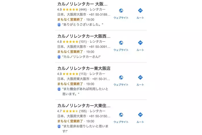 カルノリレンタカーは格安レンタカーですが『安かろう悪かろう』は徹底排除しています。格安な分、新車をレンタカーとして提供することは難しいですが、それ以外の『接客サービス』には日本一力を入れて取り組んでいます。その結果、Googleの口コミにおいて、お客さまから高評価な口コミをいただいています。