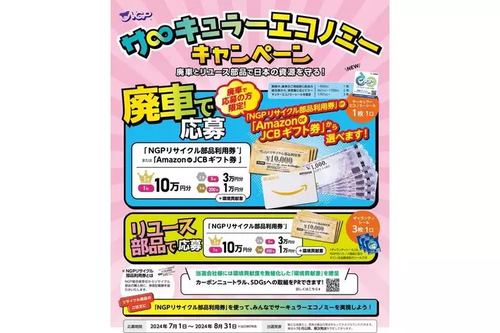 キャンペーンは、廃車の提供やリサイクル部品の利用に応じて応募できるものとしており、NGPの組合員に車両を提供していただくことで、リサイクル部品と鉄・銅・アルミ・プラスチックなどの資源が国内で循環し、サーキュラーエコノミーにも貢献できるという新たな価値の提供や、環境にやさしいNGPリサイクル部品をこれまで以上に訴求するために、賞品に「NGPリサイクル部品利用券」を設定いたしました。