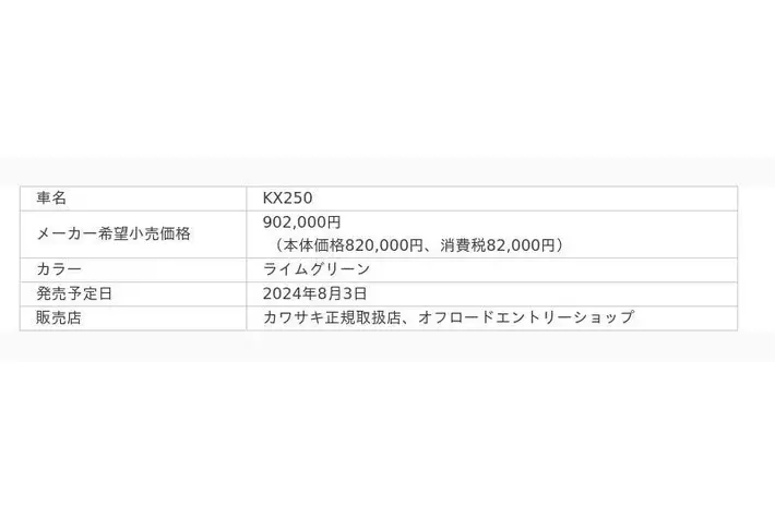 株式会社カワサキモータースジャパン(本社:兵庫県明石市、代表取締役社長:佐伯 健児)は、「KX250」「KX250X」を2024年8月3日(土)に新発売いたします。