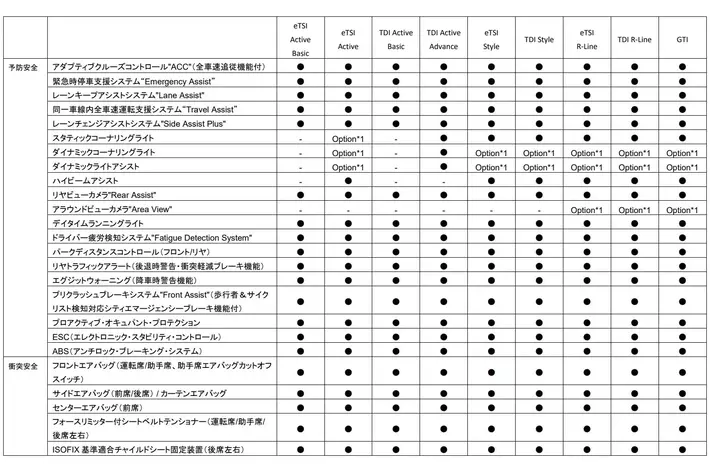 新型「Golf」主要装備表