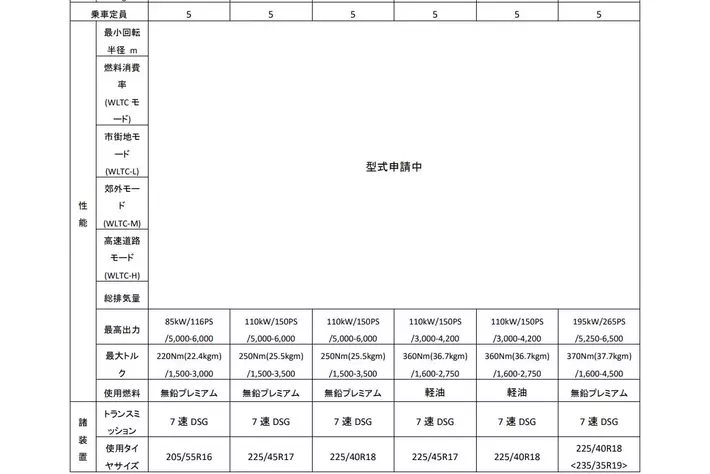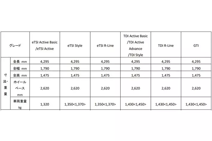 新型「Golf」 諸元表