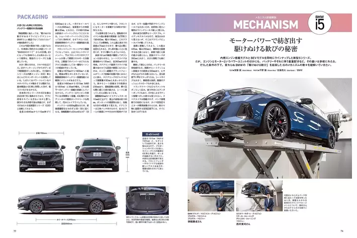 モーター、バッテリー、サスペンション、ボディ…i5を構成するメカニズムの数々を詳密にレポート。車両を実際にリフトで上げて、足まわりや下まわりをチェックするなど、本誌でしか読むことのできないメカ解説となっています。