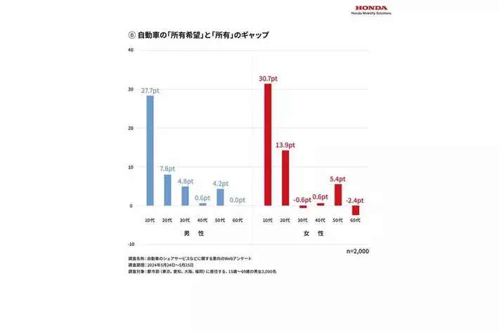 ※性別年代ごとに、所有希望の割合から所有の割合を引いた値(パーセントポイント)を算出※値がゼロ:自動車を欲しいと思う気持ちと実態が一致※値がプラス:現在自動車を所有していないが、自動車が欲しい※値がマイナス:自動車を手放したいと考えている