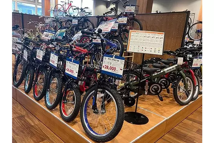 また、2階にはシティサイクル、スポーツサイクル、ミニベロ・折畳車、子供車、幼児車と幅広い年齢の方に向けた自転車をご用意いたしております。