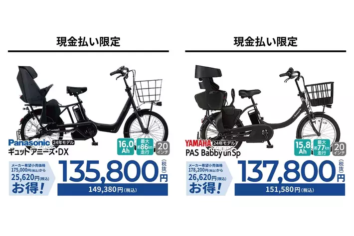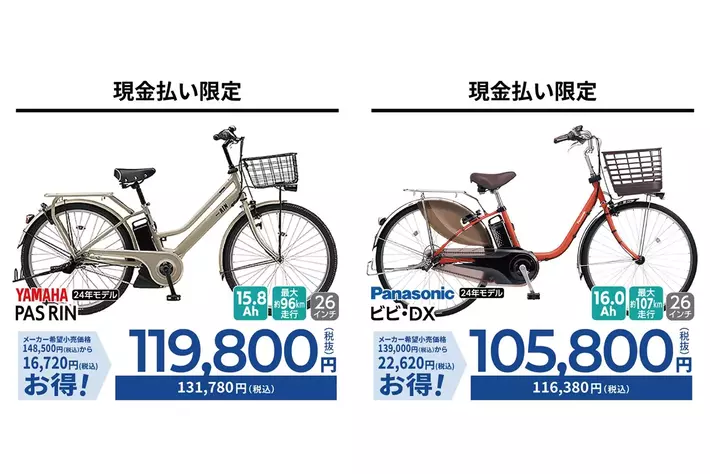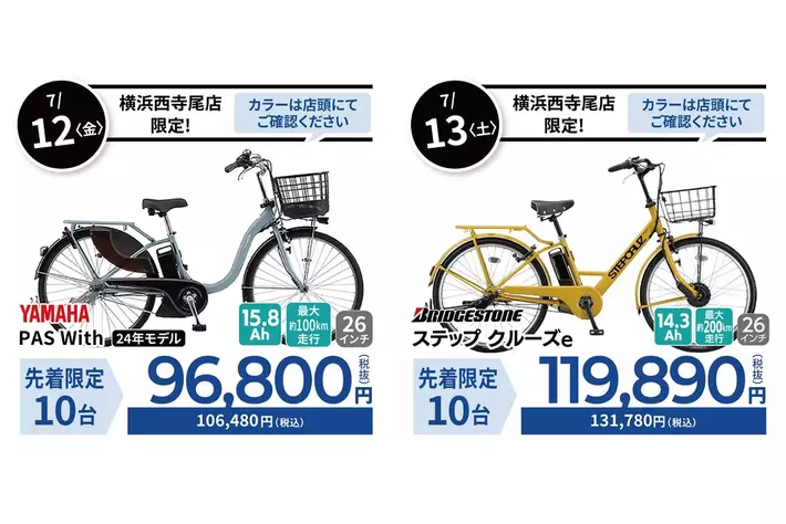 各種電動アシスト自転車に関してはWebサイト(https://www.daiwa-cycle.co.jp/feature/open_yokohamanishiterao)よりクーポンをご持参いただくと12,000円(税込)引で販売をさせていただきます。(クーポン利用については条件がございますので、クーポン券の注記をご確認の上ご利用願います。)