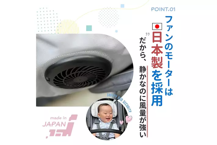 COOL BABYの送風ファンのモーターは日本製を採用!乳幼児が使用するため、安全性には徹底的にこだわり高品質を追い求めました。