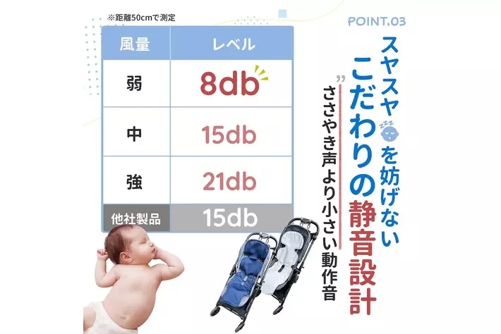 また、赤ちゃんの睡眠を妨げないようモーターの駆動音はわずか8db(弱モード・50cm離れた場所での計測)と、他社製と比較しても最も静音となっております。(他社製12db/自社調べ)