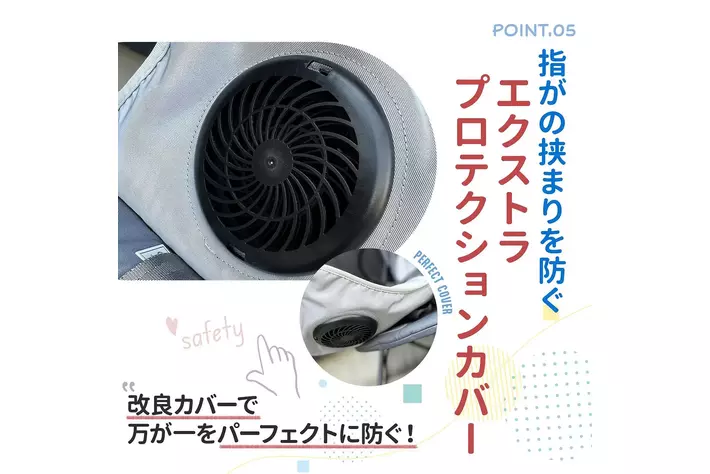 また、送風ファンにはエクストラプロテクションカバーで2重の指侵入防止構造となっており、小さな赤ちゃんの指が絶対に入らないような工夫が施されています。