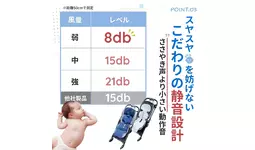 また、赤ちゃんの睡眠を妨げないようモーターの駆動音はわずか8db(弱モード・50cm離れた場所での計測)と、他社製と比較しても最も静音となっております。(他社製12db/自社調べ)