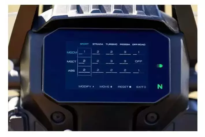 ライディング モードは、ツーリング、レイン、ロード、スポーツ、オフロードの 5 つがあります。各モードでは、3 つの異なるエンジン マップ、4 段階のトラクション コントロール、3 つの レベルのエンジン ブレーキ、および 2 段階の ABS コントロールが備わります。モト・グッツィ のテクノロジーは、ライディングにおける安全性と楽しさ を向上させるだけでなく、走行中の操作を簡素化するように設計されています。ライダーは、自分の好みに最も適したライディング モードを選択するだけで、電子パラメーターが自動で最適に調整されます。これらの設定は カスタマイズも可能で、ライダーは自分の好みに合わせてパラメーターを微調整できます。