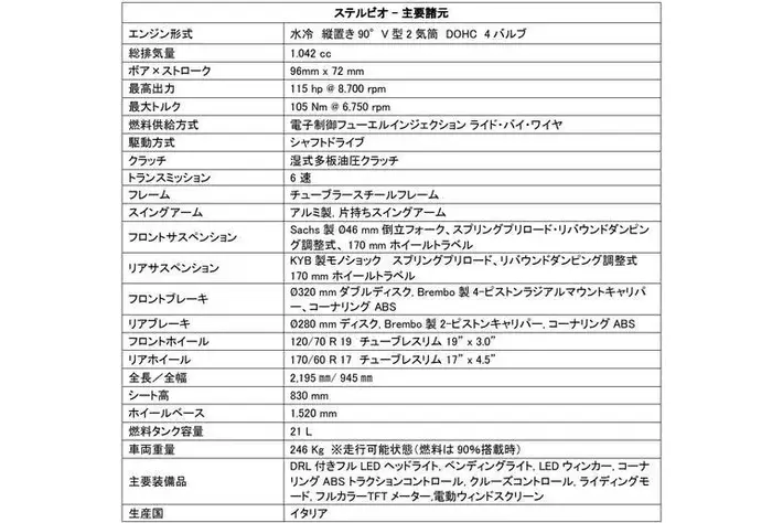 サスペンション システムはステルビオ専用に調整され、スポーティでエキサイティングなライディング性を提供 するだけでなく、ロングツーリングに必要な快適性と、170 mm の十分なトラベル量により、荒れた地形での信 頼性の高い接地感を提供します。46 mm 径のザックス製フロントフォークは、リバウンドとスプリング プリロード が調整でき、KYB 製 リアショックアブソーバーは、便利な手動式リバウンド調整とスプリング プリロードが調整 可能です。その傾斜させたレイアウトは、路面の凹凸を確実に収束し、適切な反応を提供するために、設計・セ ッティングされています。Brembo 製のブレーキ システムには、フロントに 320 mm 径のフローティング ディスク と、ラジアルマウントのモノブロック キャリパーによって確実なストッピングパワーを提供します。ハンドルバー のマスター シリンダーは、ブレーキ/クラッチ共にラジアルポンプを採用し、どちらも調整式レバーを備えていま す。リアブレーキには、280 mm 径のディスクと、デュアルピストンキャリパーを装着しています。フロント 19 イン チ、リア 17 インチのホイールは、チューブレス対応のスポーク ホイールを採用し、軽いオフロード ライディング にも対応するタイヤが装着されます。