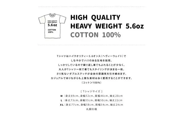 スタンダードかつシンプルなTシャツは大人がすっきりと着こなせるよう設計されており、5.6ozと厚手のため耐久性も高い仕上がりとなっています。