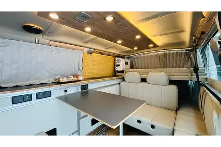 共通 ベースカー:日産キャラバン、7人乗車4人就寝、8ナンバー、サイズ:4695mm×1695mm×2555mm、燃料タンク65L、冷蔵庫20L、清水・排水各10L、シンク+カセットコンロ、リアスピーカー、ロングスライドレール、テーブル、他