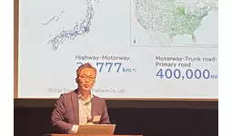 同会合では、当社プロジェクトビジネス部長の梁田 智仁が登壇。梁田は、当社が提供する高精度3次元地図データ(HDマップ)の特徴や多様な利用シーン、空港業務DXに向けたダイナミックマップの利活用に関するプロジェクト/ユースケースなどについてプレゼンテーションしました。