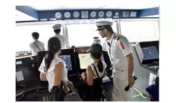 また、東京国際クルーズターミナルでは多くの子供たちが操船シミュレーターを体験操作したり、展示された船員の業務紹介パネルやMOLアンバサダー(註2)による海運新聞、GHG削減効果のある硬翼帆式風力推進装置「ウインドチャレンジャー」の模型を見学したり、船員の制服を着用して記念写真撮影や商船クイズゲーム等を楽しんでいました。