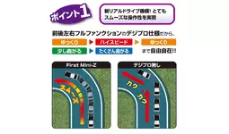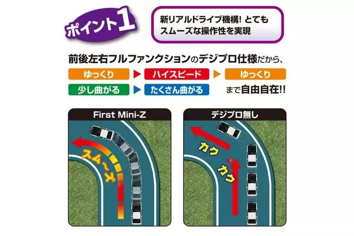 【ポイント1】新リアルドライブ機構 ~操る楽しさが体感できる~よりスムーズな走りを実現する前後左右フルファンクションの新リアルドライブ機構。実車のハンドルに相当するコントローラーのステアリングホイールを少し回せば車体は大回りし、たくさん回せば小回りします。同様に実車のアクセルに相当するコントローラーのスロットルトリガーを少し引けば低速で、大きく引けば高速で走行でき“操る楽しさ”が体感できます。