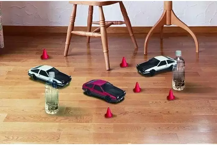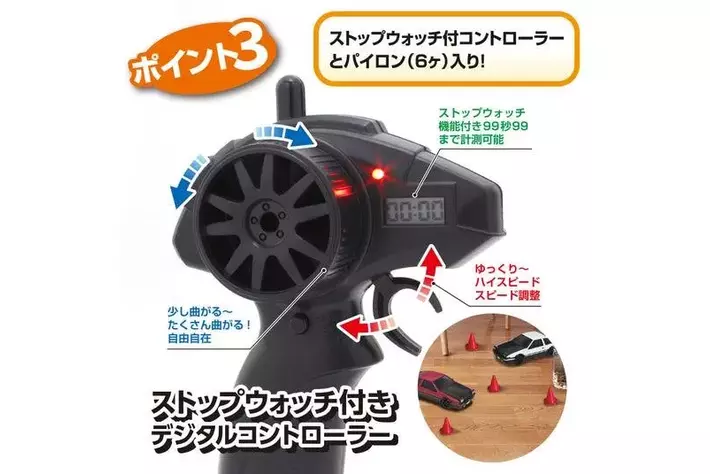 【ポイント3】自宅でタイムアタック ~レース気分満点のストップウォッチ付きデジタルコントローラー~業界初となるストップウォッチ機能(99秒99まで計測可能)を搭載したコントローラーが付属。また、ミニパイロン(6個)も同梱しているので家の中でコースを作ってのタイムアタックに加え、最大12台の同時走行が可能な2.4GHzの電波を採用しているため、レースも楽しめます。