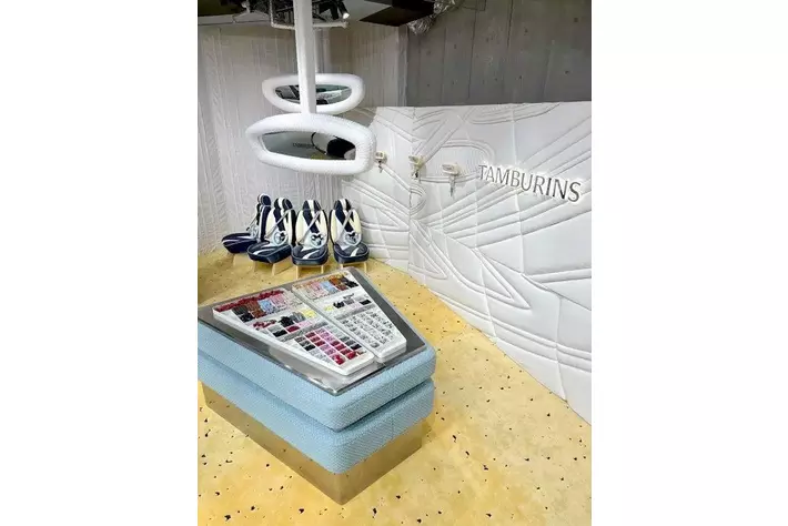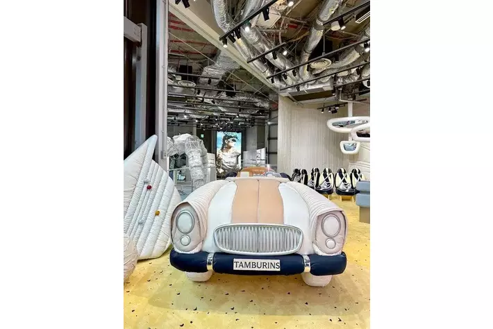 今回のカーディフューザーの発売を記念して、タンバリンズ東京青山フラッグシップストアの1階は、タンバリンズの自動車の世界観を表現するポップアップ空間に変貌した。ほのかな色合いのカーディフューザーからインスピレーションを受けてデザインされた空間は、タンバリンズが想像する美学が込められた自動車を一つのアートウォールとして表現した。他では出会えない個性的なカーシートとハンドルのデザインを通して、タンバリンズならではの新しい美学体験を提供する。