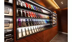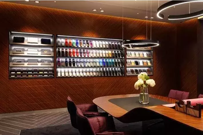 最大の見どころである、ビスポークのためのスペース「アトリエ(Atelier)」には、ウッドパネル、レザー、刺繍糸、ラムウールやテキスタイルのサンプルといった、ブランドの最も精巧な職人技に関わる様々なマテリアルが美しくディスプレイされています。色鮮やかなエクステリアのカラーはおなじみのスピードフォームで、インテリアのレザーサンプルはロールス・ロイスを象徴する傘の持ち手をあしらったバーに美しく巻かれ、ロールス・ロイスならではの多彩な組み合わせをご覧いただけます。