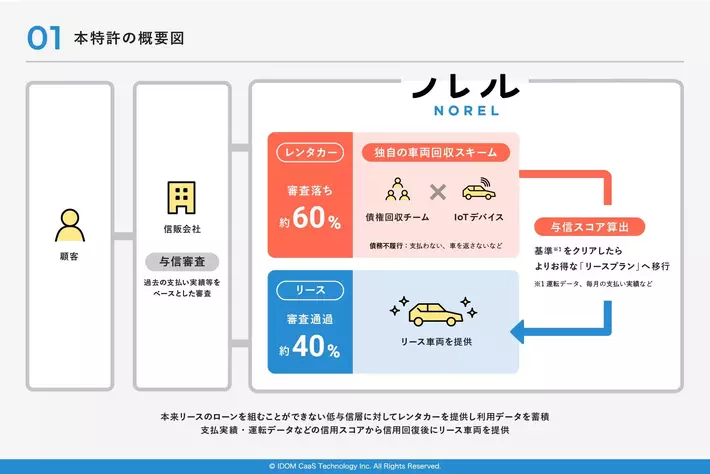 中古車のガリバーから誕生し、「乗りたい、を叶える。乗れない、をなくす。」をミッションに掲げる 「ノレル(NOREL)」(以下、ノレル)を運営する株式会社IDOM CaaS Technology(本社:東京都千代 田区、代表取締役社長:山畑 直樹、以下、ICT)は、社会的信用や支払い能力が低い方でもクルマに乗れる独自の車両提供フローを構築し、特許出願を完了したことをお知らせいたします(特許出願番号:JP 2024-53104)。
