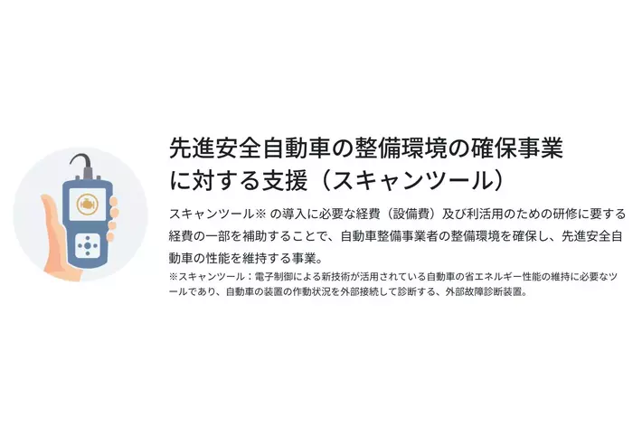 自動車整備事業者による整備の促進と整備機会の拡大のため、スキャンツールの導入に必要な経費(設備費)と利活用のための研修に要する経費の一部を補助することで、自動車整備事業者の整備環境を確保し、先進安全自動車の性能維持を行う事業者