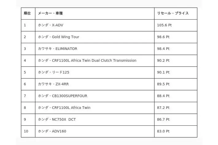 バイク未来総研、『リセール・プライス』ランキングを発表『ホンダ・X-ADV』が首位獲得!