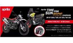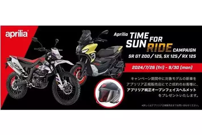 ピアッジオグループジャパン株式会社(本社:東京都港区芝二丁目、代表取締役:ネリ・ミクラウス)は、日常に おける小さな冒険にも楽しめるアーバンスポーツスクーター『SR GT 200/SR GT 125』と、125 ccでありながら本 格的なデザインとパワフルな走りを実現したオフロードモデル『RX 125』と、その車体を活用したモタードモデル 『SX 125』をご購入いただいた方に、アプリリア純正のオープンフェイスヘルメットをプレゼントする『TIME FOR SUN RIDE』キャンペーンを全国のアプリリア正規販売店にて、2024 年 7 月 26 日(金)から 9 月 30 日(月)まで 実施いたします。