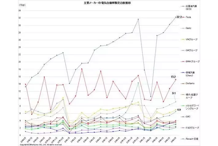 首位はBYDで前月から2.0万台増の32.2万台。2位のTeslaは前月から2.5万台増の15.2万台。3位はGeelyで前月から0.8万台増の9.1万台。4位のVWグループは0.7万台増で6.9万台。GMグループは前月から1.1万台増の6.5万台で5位となった。