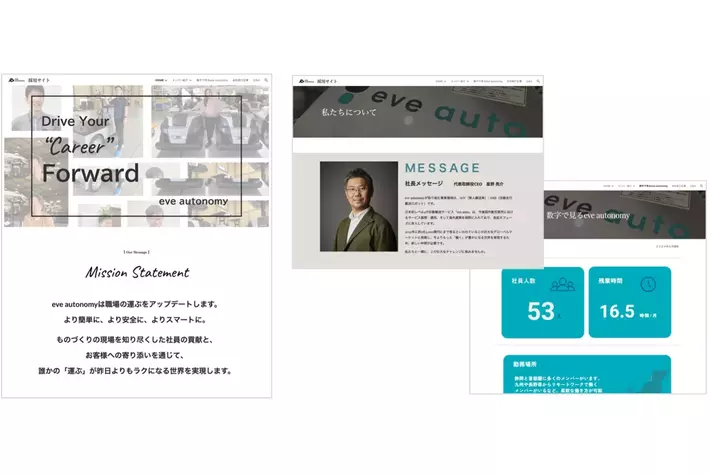 成長を続けるeve autoサービスを支える優秀な人材を募集するため、eve autonomyは新たに採用サイトを立ち上げました。新しい採用サイトでは、会社のビジョンやミッション、現在の募集職種、福利厚生などが詳細に紹介されています。また、社員インタビューや職場の雰囲気を伝えるコンテンツも豊富に掲載されており、求職者にとって現場の状況が伝わる、非常に有益な情報が満載です。