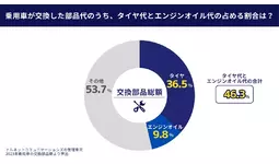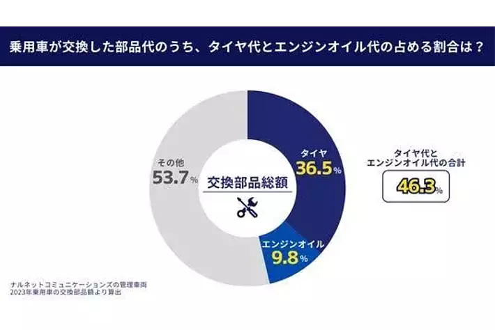 下記のデータは、ナルネットコミュニケーションズが2023年度に自動車整備工場へ依頼した交換作業の部品額の割合です。部品総額のうち、タイヤ代とエンジンオイル代が全体の46.3%を占めます。