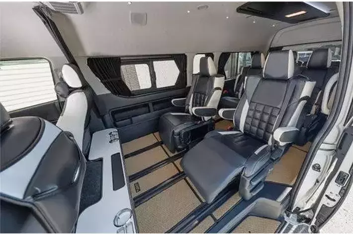 ファインテックツアラーは、トヨタの子会社であるトヨタ車体がビジネス送迎車として製作した10人乗り特別架装車両です。シートは2列目/3列目をリラックスできるキャプテンシート、4列目を4人掛けベンチシートで、従来のワゴンタイプのハイエースに比べ、ゆったりとくつろげるシートレイアウトとなっているのが特徴です。