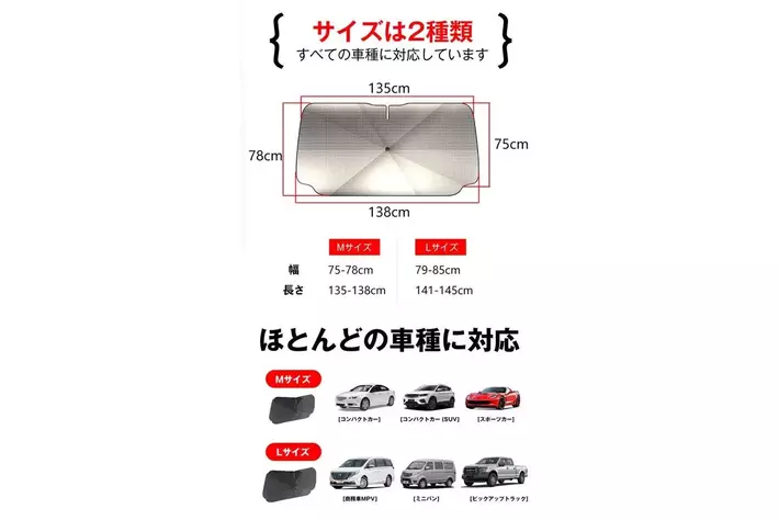 - サイズは2種類、どの車種にも対応します。折り畳み傘の様にコンパクトに収納でき、持ち運びも便利☆