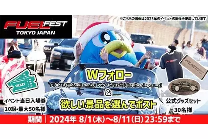 「ドン・キホーテ」が「FUELFEST JAPAN」のオフィシャル・スポンサーに決定!「ドンキ公式X」&「アピタ・ピアゴ公式X」をWフォローすると、公式グッズやイベント入場券が当たるキャンペーンを実施