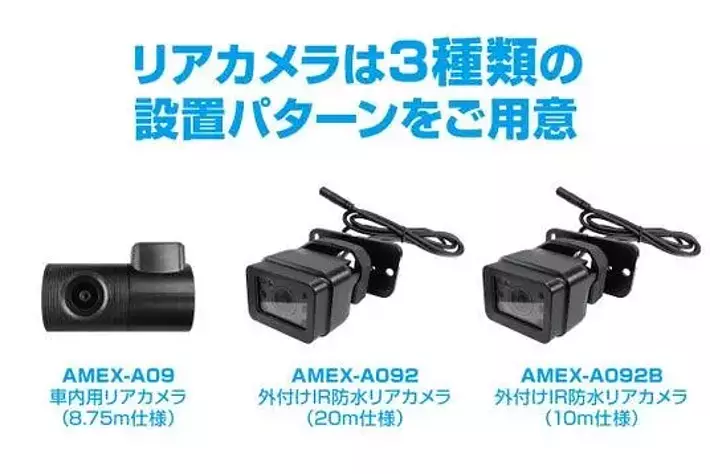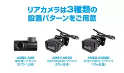 AMEX-A09シリーズは、一般向けモデル「AMEX-A09」と、外付けIR防水リアカメラ付属の業務用モデル「AMEX-A092(20mケーブル仕様)」と「AMEX-A092B(10mケーブル仕様)」の3種類展開となります。本シリーズは、「AMEX-A08 (2023年発売)」の後継機種となります。